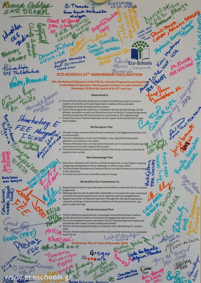 H επετειακή για τα 25 χρόνια "Οικολογικά Σχολεία", διακήρυξη αποτελεί τη δέσμευση μας στην ανάπτυξη του προγράμματος από τις 68 χώρες σε κάθε χώρα του κόσμου, βοηθώντας και ενδυναμώνοντας νέους ανθρώπους να προβούν σε θετικές πράξεις για ένα αειφόρο μέλλον για όλους.