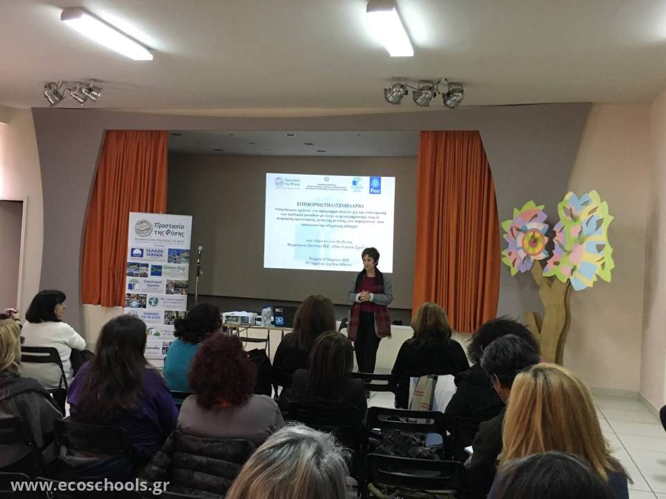 Η Ελληνική Εταιρία Προστασίας της Φύσης, Εθνικός χειριστής του Διεθνούς Θεματικού Δικτύου Περιβαλλοντικής Εκπαίδευσης «Οικολογικά Σχολεία» και η Διεύθυνση Δευτεροβάθμιας Εκπαίδευσης Β΄ Αθήνας Συντονιστικός Φορέας του Δικτύου, συνδιοργάνωσαν Επιμορφωτικό σεμινάριο εκπαιδευτικών, με θέμα «Οικολογικά Σχολεία : Ένα πρόγραμμα πλαίσιο για την ενδυνάμωση των σχολικών μονάδων με στόχο το μετασχηματισμό τους σε αειφόρους οργανισμούς, μέσω της μείωσης των παραγόντων που επιτείνουν την κλιματική αλλαγή».