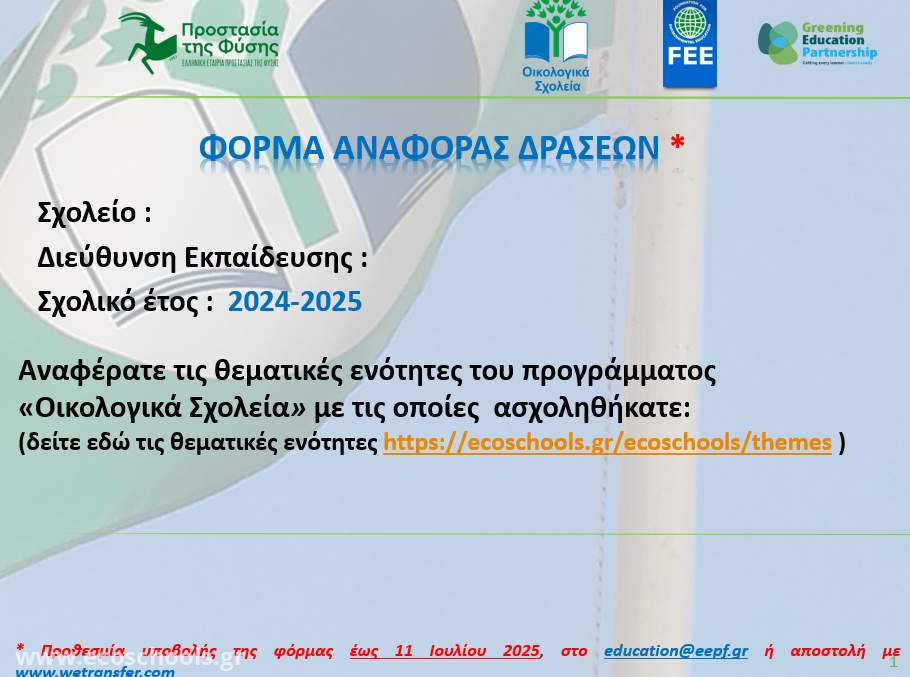 Αναμένουμε τη συμπλήρωση της φόρμας αναφοράς δράσης για τη συμμετοχή του σχολείου σας στο Θεματικό Δίκτυο Περιβαλλοντικής Εκπαίδευσης «Οικολογικά Σχολεία» για τη σχολική χρονιά 2024-2025, έως τις 11 Ιουλίου 2025 (είτε απαντώντας στο παρόν e-mail, είτε με την αποστολή της με wetransfer.com) και να καταγράψουμε κι εμείς με τη συμμετοχή μας την αλλαγή που θέλουμε να δούμε στον κόσμο μέσα από τις μικρές και μεγάλες δράσεις των σχολείων μας.