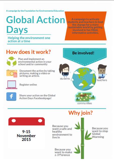 Tο ‘Ίδρυμα για την Περιβαλλοντική Εκπαίδευση (FEE), Διεθνής Συντονιστής του Δικτύου «Οικολογικά Σχολεία», χειριστής του οποίου στην Ελλάδα είναι η Ελληνική Εταιρία Προστασίας της Φύσης, θεσπίζει φέτος την καμπάνια Global Action Days (GAD - http://www.ecoschools.global/global-action-days/about/), η οποία χρονικά τοποθετείται στις 9-15 Νοεμβρίου 2015.