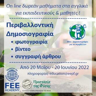 Τα δωρεάν on-line μαθήματα περιβαλλοντικής δημοσιογραφίας (φωτογραφία, βίντεο, συγγραφή), που διοργανώνει το FEE (Foundation for Environmental Education), Διεθνής Χειριστής των προγραμμάτων: Οικολογικά σχολεία, Μαθαίνω για τα Δάση και Νέοι Δημοσιογράφοι για το Περιβάλλον, συνεχίζονται (από 20 Μαΐου έως 20 Ιουνίου 2022) μέσω της πλατφόρμας σύγχρονης και ασύγχρονης εκπαίδευσης https://feeacademy.global/, για τους μαθητές/μαθήτριες & τους εκπαιδευτικούς, τα σχολεία των οποίων