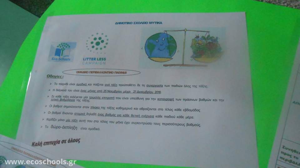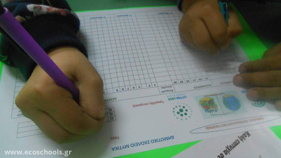 Με αφορμή τη συμμετοχή μας στην καμπάνια litter less αλλά και με δεδομένες τις καλές πρακτικές εδώ και χρόνια στη διαχείριση των απορριμμάτων στο σχολείο μας, παίζουμε αυτό το μήνα όλοι μαζί ένα περιβαλλοντικό παιχνίδι. Στο παιχνίδι αυτό επιβραβεύονται φιλικές προς το περιβάλλον συμπεριφορές με πράσινους βαθμούς. Για παράδειγμα εάν ένα παιδί μια μέρα φέρει οργανικά υπολείμματα και τα βάλει στον κομποστοποιητή παίρνει ένα πράσινο βαθμό.