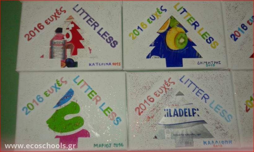 Στις 23/12/15 οι μαθητές της περιβαλλοντικής μας ομάδας έφτιαξαν έργα με θέμα εμπνευσμένα από το litter less. Πήραν υλικά από τα σκουπίδια της ανακύκλωσης , τα καθάρισαν και έφτιαξαν ημερολόγια και τελάρα «ζωγραφικής» με το σύνθημα «litter less- 2016 ευχές». Τα έργα αυτά πουλήθηκαν στο χριστουγεννιάτικο παζάρι που έγινε μαζί με τον σύλλογο γονέων του σχολείου μας.