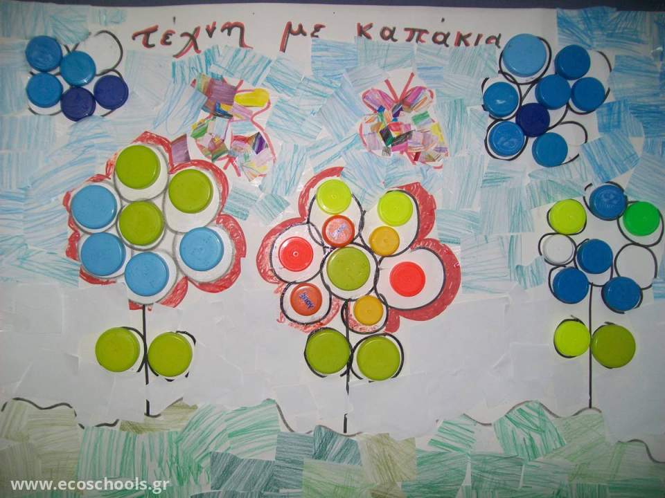 Ολοκληρώνοντας σιγά σιγά το στάδιο των οικολογικών μας κατασκευών,στα πλαίσια του προγράμματος των Οικολογικών Σχ. και με βάση τον στόχο μας για μείωση και επαναχρησιμοποίηση του χαρτιού με τους μαθητές μου και τις μαθήτριές μου (Α 2 τάξη - 2ο ΔΣ Γέρακα) δημιουργήσαμε έναν μικρό κήπο με γλαστράκια απο πλαστικά μπουκάλια, πίνακα με τα καπάκια τους,κατασκευές από ρολά κουζίνας και χαρτόκουτα