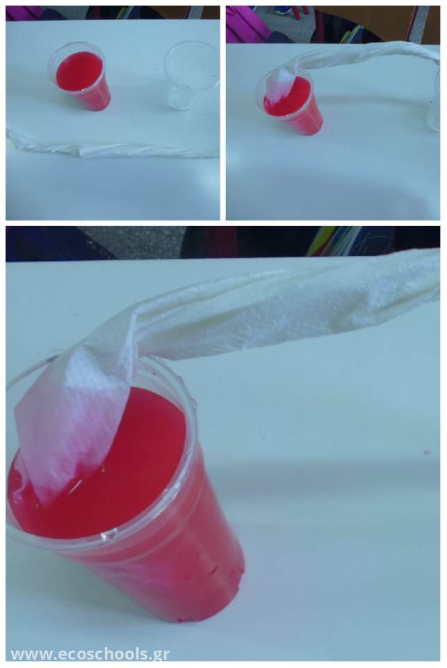 3. Παρατηρούμε τι συμβαίνει (σ’ αυτό το στάδιο χρειάζεται υπομονή). Για να παρακολουθήσουμε καλύτερα την κίνηση του νερού χρησιμοποιούμε λευκή χαρτοπετσέτα και χρωματίσει το νερό με χρώμα ζαχαροπλαστικής!
