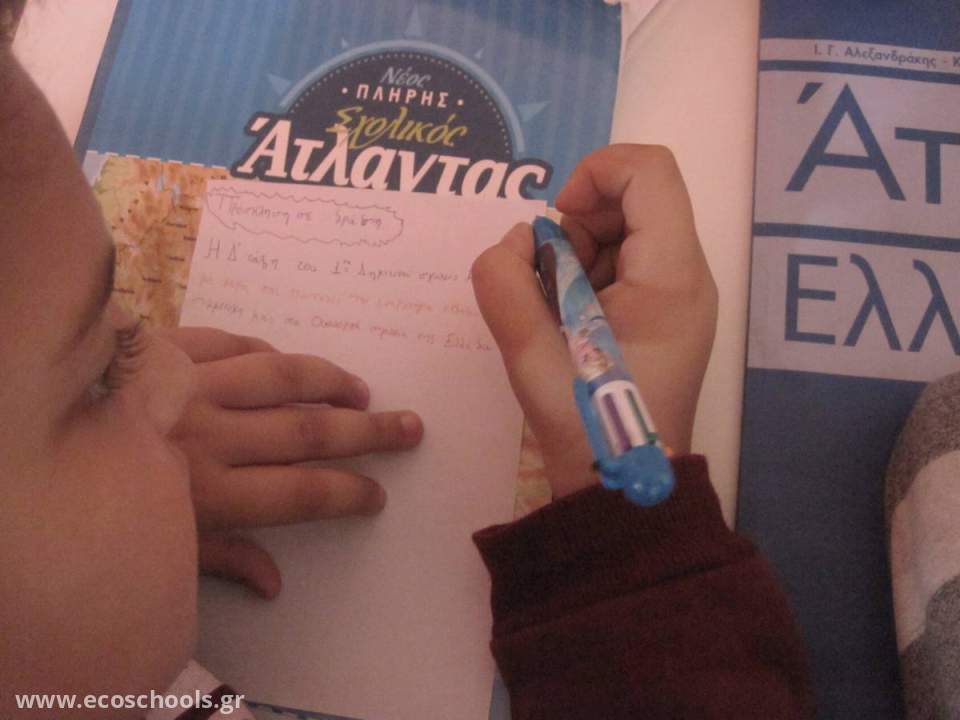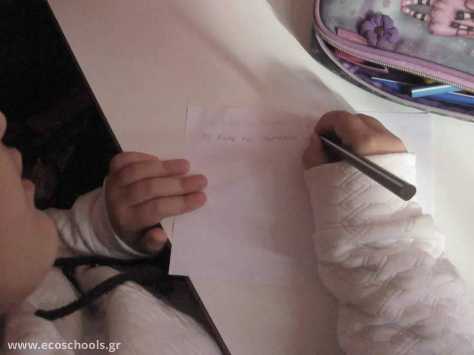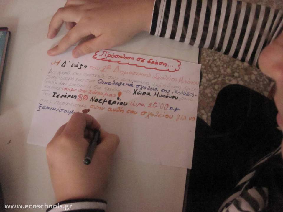 Φτιάξαμε προσκλήσεις επαναχρησιμοποιώντας χαρτί και καλέσαμε γονείς να συμμετέχουν στην εναρκτήρια εκδήλωση για τη συμμετοχή μας στο δίκτυο των Οικολογικών σχολείων. Την Παρασκευή 2 Δεκεμβρίου στις 10:00 π.μ. θα ξεκινήσουμε από την αυλή του σχολείου μας και χωρισμένοι σε ομάδες θα καθαρίσουμε την πόλη μας από τα απορρίμματα. Καλεσμένη μας φυσικά είναι και η υπηρεσία καθαριότητας του Δήμου Μυκόνου. Γιατί όλοι μαζί μπορούμε!!!