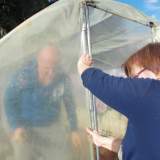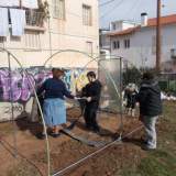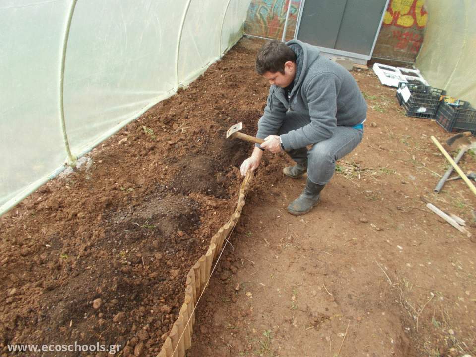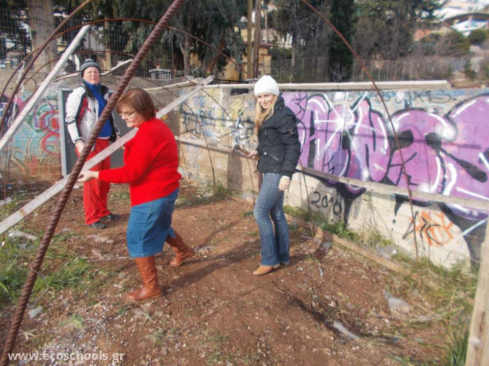 Αρχικά πραγμοτοποιήθηκε απομάκρυνση του παλαιού σκελετού του θερμοκηπίου (σιδερόβεργες και σιδερένιο πλέγμα) και εγκατάσταση νέου. Τα υλικά επαναχρησιμοποιήθηκαν στο πνέυμα της ανακύκλωσης, σε άλλα σημεία του σχολείου όπως η υποστήριξη του τοιχείου στο παρτέρι πλησίον του θερμοκηπίου.