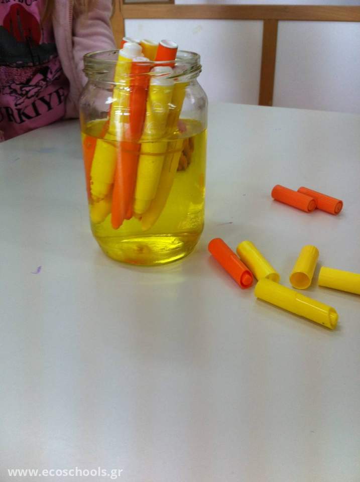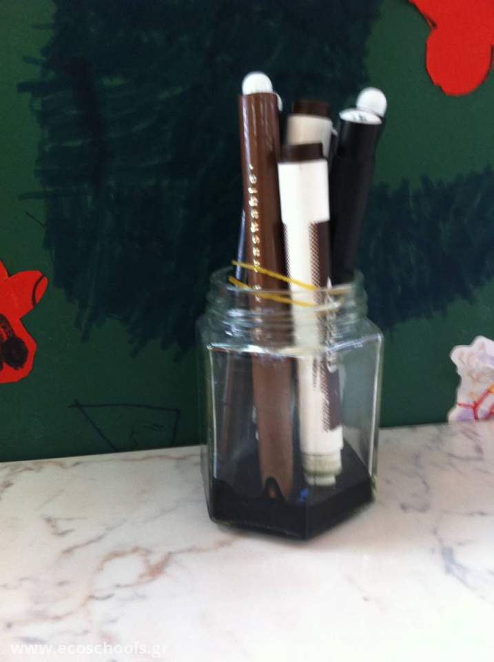 Είναι βασικό οι μαθητές του νηπιαγωγείου να έρθουν βιωματικά σε επαφή με τεχνικές και δραστηριότητες ανακύκλωσης. Με γνώμονα την ευαισθητοποίηση τω μαθητών σε θέματα διαχείρισης αποριμμάτων και επαναχρησιμοποίησης των υλικών - σκουπιδιών της τάξης ανακυκλώσαμε τους μαρκαδόρους μας. Συγκεκριμένα, χαλασμένοι μαρκαδόροι τοποθετήθηκαν ανά χρώμα σε βαζάκια με νερό προκειμένου να χρησιμοποιηθούν ως νερομπογιές και άρα έμπρακτα να ανακυκλωθούν αφού με αυτές θα ζωγταφίσουμε νέα έργα.