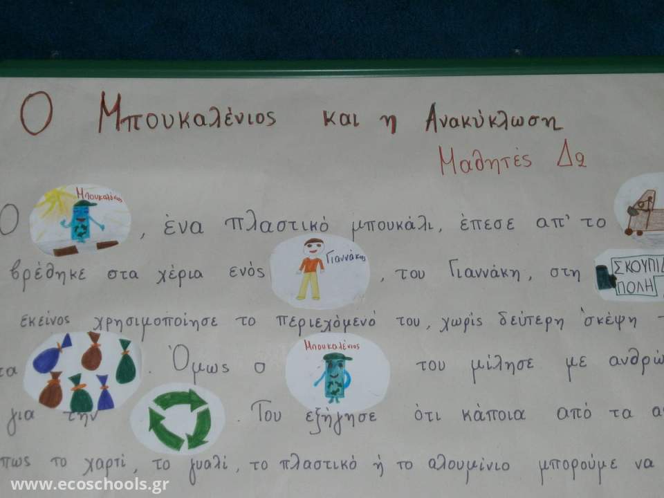 Στο πλαίσιο του προγράμματος “Litter less” που εκπονεί το σχολείο μας, οι μαθητές της Δ2 τάξης, με τη δασκάλα τους, κ. Αικ. Αραμπατζή, έγραψαν και εικονογράφησαν το δικό τους παραμύθι με τίτλο: «Ο Μπουκαλένιος και η Ανακύκλωση». Επίσης την περίληψή του την παρουσίασαν με την τεχνική του εικονοπαραμυθιού.