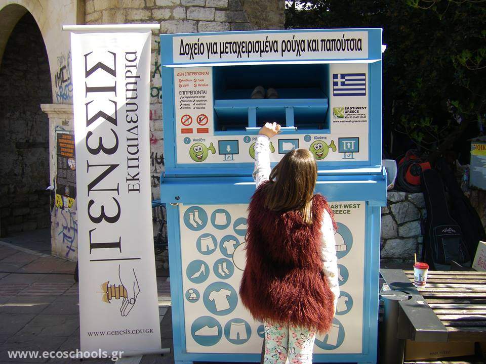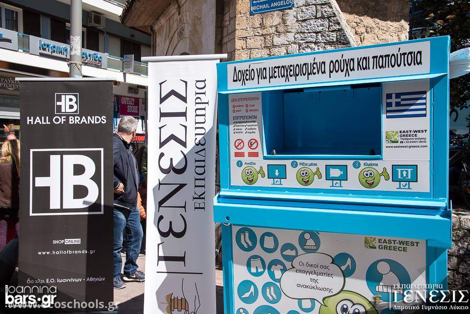 Το Ιδιωτικό σχολείο ΓΕΝΕΣΙΣ διοργάνωσε μια εκδήλωση που αφορά την ανακύκλωση μεταχειρισμένων ρούχων και παπουτσιών στο κέντρο της πόλης των Ιωαννίνων σε συνεργασία με το κατάστημα 'HALL OF BRANDS' .Oι πολίτες των Ιωαννίνων,μικροί και μεγάλοι, τοποθέτησαν στο ειδικό δοχείο παλιά και μεταχειρισμένα ρούχα και παπούτσια και κέρδισαν ένα εκπτωτικό κουπόνι στα HALL OF BRANDS.Μ'αυτόν τον τρόπο,ενθαρρύναμε όλον τον κόσμο να ανακυκλώσει παλιά ρούχα και παπούτσια διαδίδοντας στην πόλη και την αξία της ανακύκλωσης!