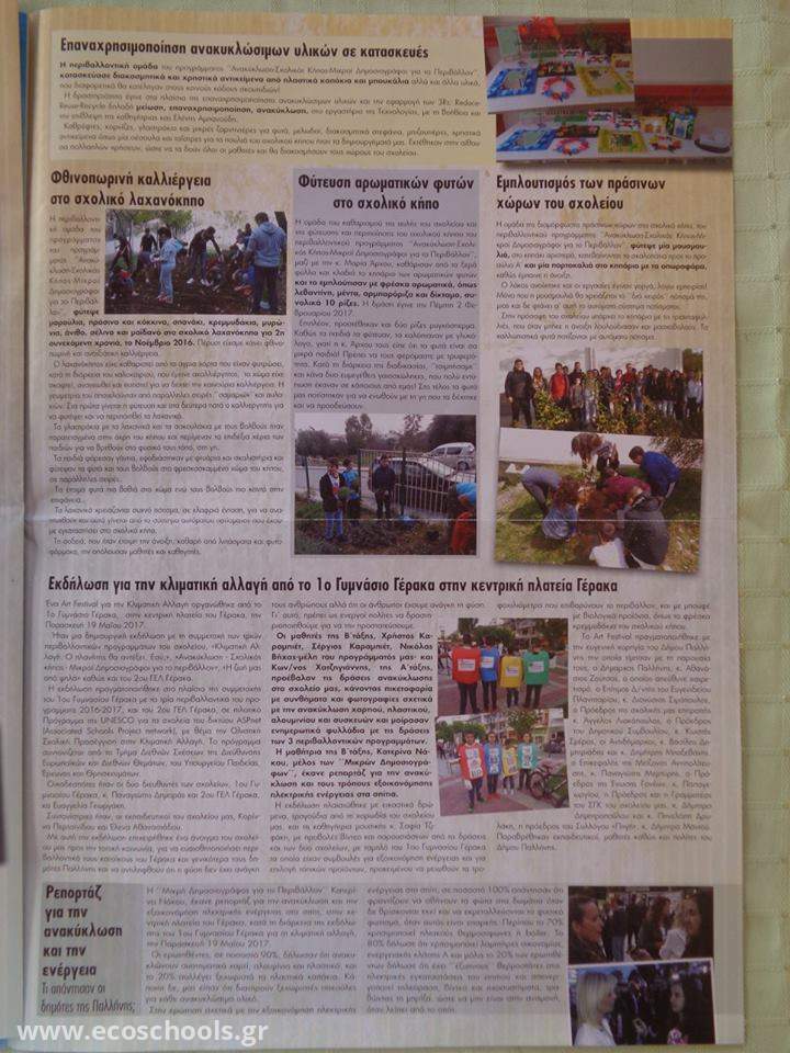 Η περιβαλλοντική ομάδα του σχολικού προγράμματος '' Ανακύκλωση-Σχολικός Κήπος-Μικροί Δημοσιογράφοι για το Περιβάλλον'' 2016-2017, του 1ου Γυμνασίου Γέρακα, εξέδωσε εφημερίδα, που έκανε την πρώτη της εμφάνιση στη γιορτή αποφοίτησης της Γ΄ τάξης, που οργάνωσε ο Σύλλογος Γονέων και Κηδεμόνων, την Παρασκευή 30 Ιουνίου 2017 και μοιράστηκε σε έντυπη μορφή, στους μαθητές και σε όσους μας τίμησαν με την παρουσία τους.