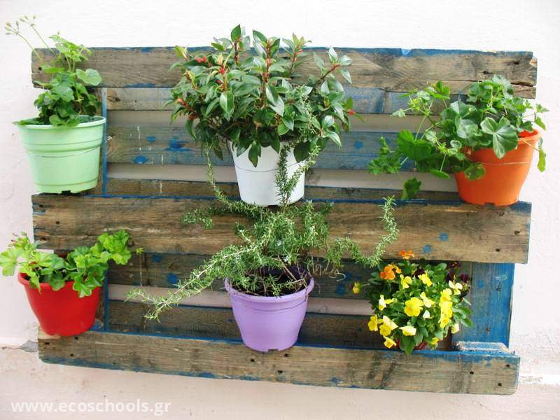φθινοπωρινά φυτέματα στον κήπο μας-τοποθέτηση παλετών στην αυλή με γλαστράκια κρεμασμένα πάνω τους..