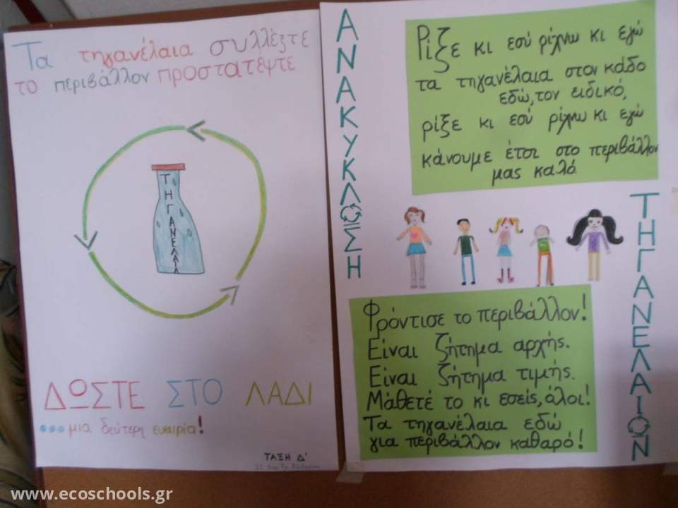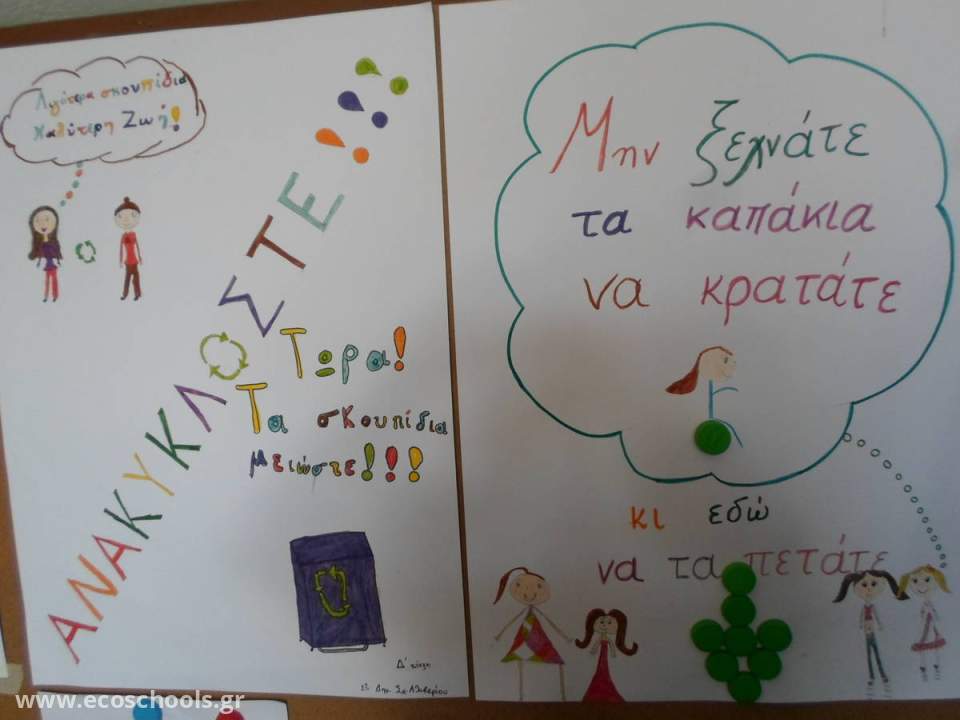 Δημιούργησαν ένα οικοκώδικά για τα απορρίμματα ,έγραψαν οικολογικά μηνύματα και κατασκεύασαν αφίσες για την ανακύκλωση συσκευασιών, για τη συλλογή μπαταριών, τη συλλογή τηγανέλαιων και τη συλλογή καπακιών.