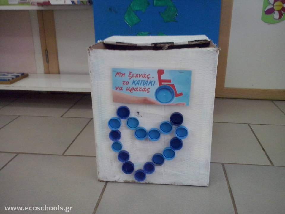 Φτιάξαμε με χαρτόκουτο κάδο ανακύκλωσης, στον οποίο θα μαζέυουμε καπάκια μπουκαλιών , τα οποία στη συνέχεια θα χρησιμοποιηθούν για την κατασκευή αναπηρικών αμαξιδίων.