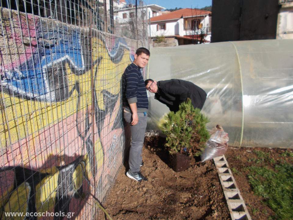 Φυτεύσαμε ετήσιους θάμνους (τούγιες και πικροδάφνες) για να καλύψουμε το τοιχίο που μελοντικά θα προσδίδει άλλη μια πράσινη γωνιά στο σχολείο μας.