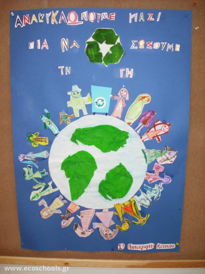 Μετά το πείραμα, χάρη στο οποίο τα παιδιά ανακάλυψαν ένα από τα σημαντικότερα οφέλη της ανακύκλωσης- τη μείωση των απορριμμάτων- γεννήθηκε η επιθυμία να παροτρύνουμε κι άλλους να ακολουθήσουν το παραδειγμά μας. Προέκυψε ένα σύνθημα και το σύνθημα έγινε η αφίσα μας. ΑΝΑΚΥΚΛΩΝΟΥΜΕ ΜΑΖΙ ΓΙΑ ΝΑ ΣΩΣΟΥΜΕ ΤΗ ΓΗ.