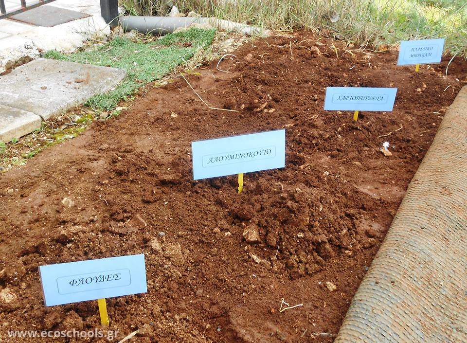 Με τη βοήθεια των εκπαιδευτικών, οι μαθητές μας πραγματοποίησαν πείραμα στο προαύλιο του σχολείου μας.Στόχος του πειράματος είναι να παρατηρήσουν τα παιδιά πόσο καιρό χρειάζεται το χαρτί,το ,αλουμίνιο,το πλαστικό και οι φλούδες μήλου για να διασπαστούν στη φύση!Τα παιδιά έσκαψαν βαθιά σε τέσσερα σημεία,τοποθέτησαν τα αντικείμενα και στη συνέχεια τα κάλυψαν με χώμα.Με το πέρασμα δύο μηνών θα τα βγάλουμε για να δούμε την τυχόν αλλοίωση τους!Τοποθετήσαμε και ταμπελίτσες ώστε να είναι ευδιάκριτα τα σημεία στα οποία είναι τα αντικείμενα μας!