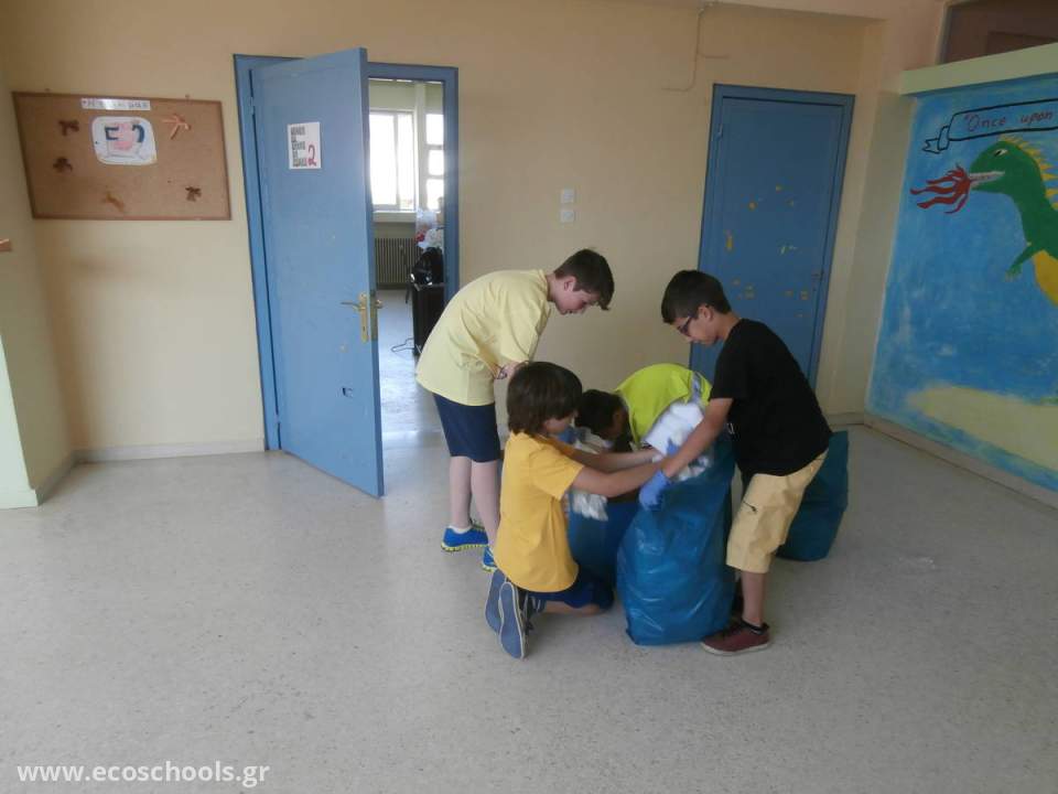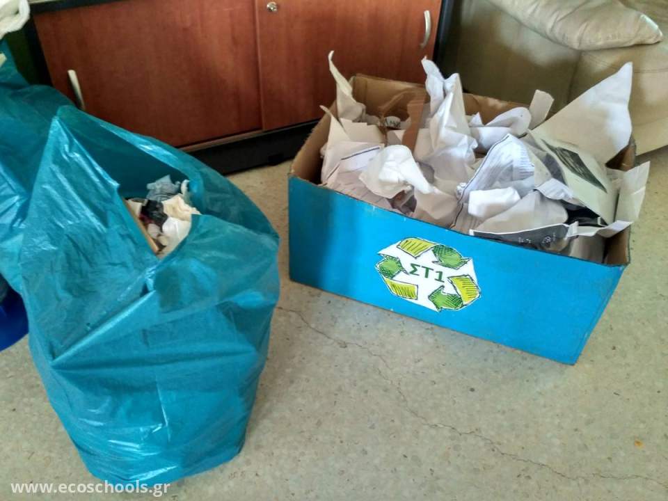 Ένα από τα μεγαλύτερα στοιχήματα που βάλαμε από την αρχή του προγράμματος ήταν να μην αφήσουμε ούτε ένα κομματάκι χαρτιού να πάει χαμένο. Έτσι αυτοσχέδιοι κάδοι συλλογής χαρτιού τοποθετήθηκαν σε κάθε αίθουσα του σχολείου και οι μαθητές των μεγάλων τάξεων κάθε Παρασκευή μετέφεραν το περιεχόμενό τους στους κάδους ανακύκλωσης.