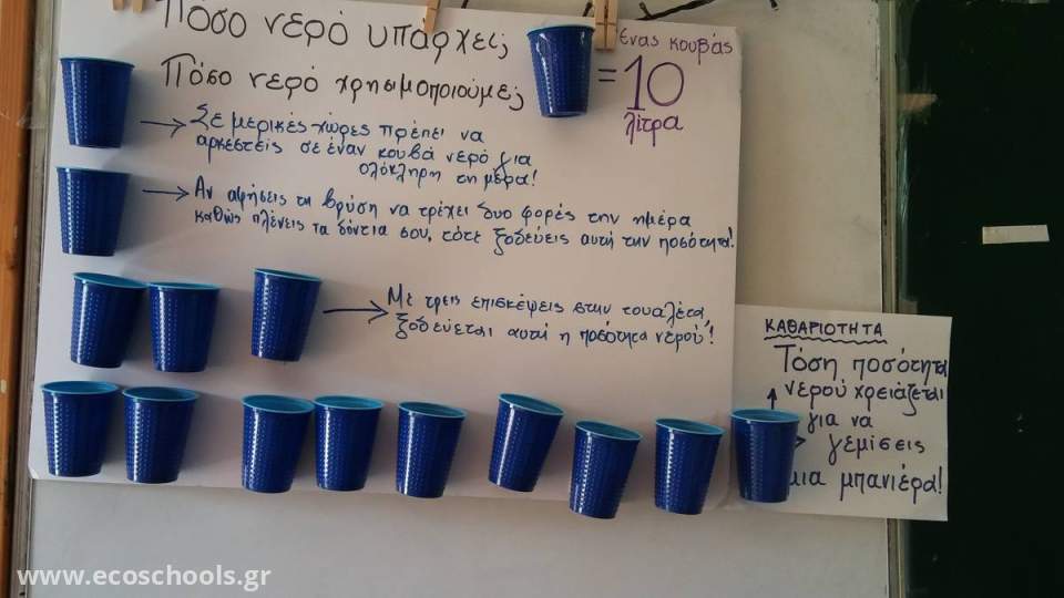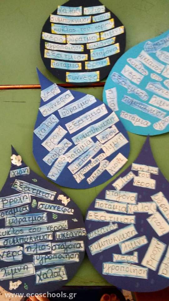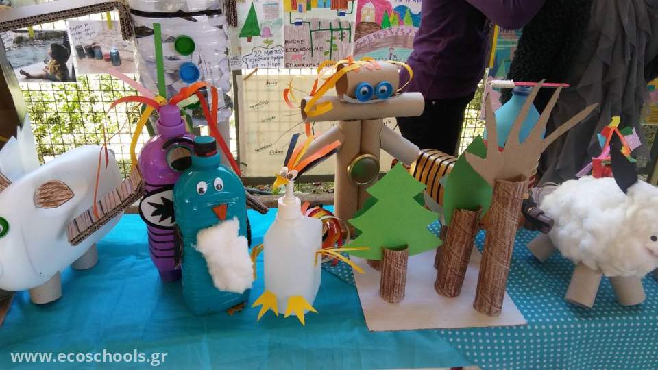 Καθώς απορρίμματα, ανακύκλωση και νερό είναι αλληλένδετα και υπάρχει σταθερή αλληλεπίδραση μεταξύ τους αφού τίποτα δε γίνεται, δε δημιουργείται και δεν φτιάχνεται χωρίς νερό, συλλέξαμε συσκευασίες και απορρίμματα και κατασκευάσαμε διακοσμητικά κι όχι μόνο αντικείμενα. Έτσι θέλαμε να δείξουμε ότι η ανακύκλωση κι η επαναχρησιμοποίηση όχι μόνο εξοικονομεί ύλες αλλά κυρίως νερό αφού τίποτα δεν μπορεί να κατασκευαστεί χωρίς νερό κι άρα η σπατάλη υλικών είναι και σπατάλη νερού.