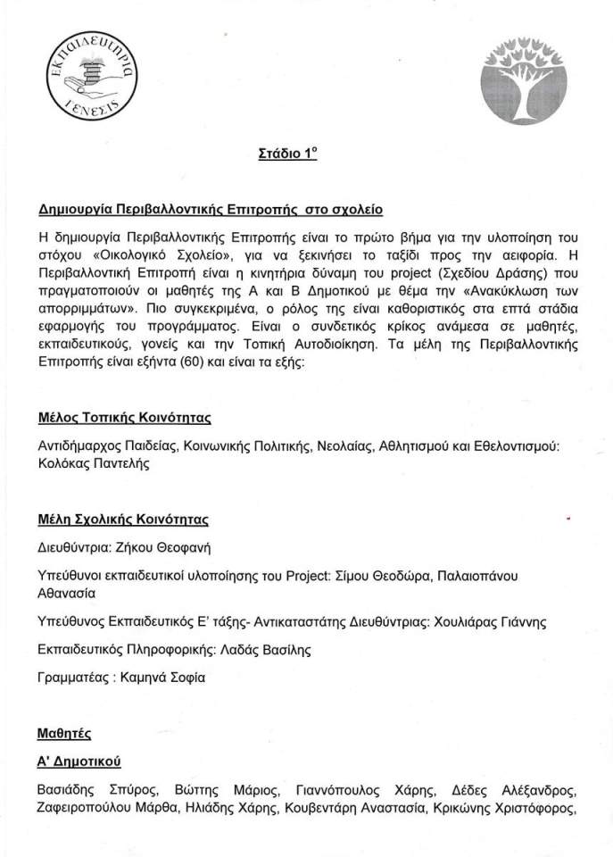 Παρακάτω σας αποστέλλουμε σε δύο αρχεία την Περιβαλλοντική Επιτροπή του Δημοτικού Σχολείου των Εκπαιδευτηρίων ΓΕΝΕΣΙΣ που αποτελείται από εξήντα μέλη συνολικά.