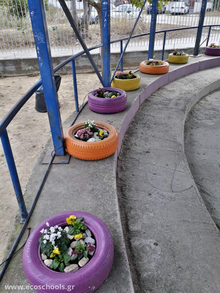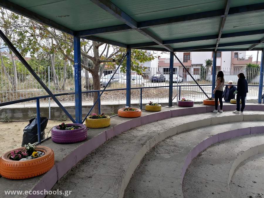 Η πρώτη μας δράση αποφασίσαμε να είναι η ανανέωση των λουλουδιών στα ελαστικά που έχουν τοποθετηθεί στο μικρό αμφιθέατρο που υπάρχει στην αυλή του σχολείου.
