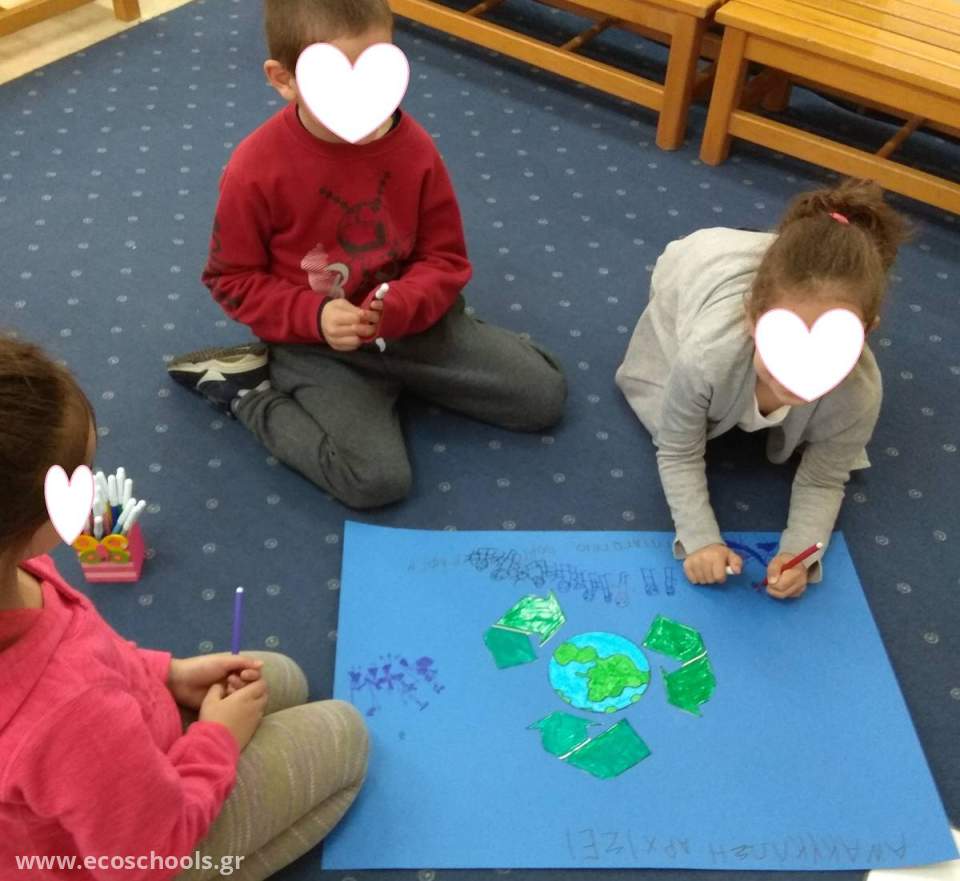 Τα παιδιά δημιούργησαν αφίσα για τη διάδοση του μηνύματος της υπεύθυνης διαχείρισης των απορριμμάτων. Έγραψαν: 1. Στέλνουμε μήνυμα, 2. Αναλαμβάνουμε δράση, 3. Ανακύκλωση αρχίζει και 4. Να σώσουμε τη φύση. Ζωγράφισαν τις ιδέες τους, χρωμάτισαν τη γη και το σήμα της ανακύκωσης, τα έκοψαν και τα κόλλησαν.