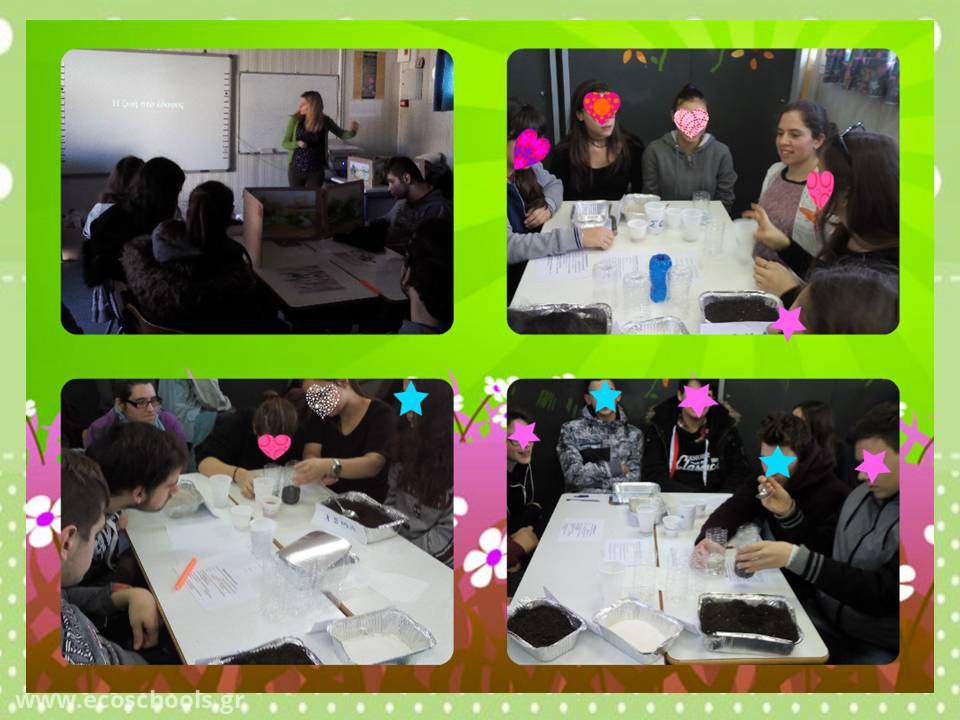Συγκεκριμένα, μετρήσαμε το ph του εδάφους των παρτεριών του σχολείου με εμπειρικό τρόπο αλλά και με την χρήση ph μέτρου. Έπειτα, με την προσθήκη διαφόρων υλικών (π.χ. ασβέστη, στάχτυ, κιμωλία, κοπριά κ.α.) διαπιστώσαμε την μεταβολή του σε αλκαλικό ή όξινο αναλόγως, αναφέροντας παράλληλα και τις απαιτήσεις βασικών λαχανοκομικών και ανθοκομικών φυτών σε αυτό. Οι μαθητές, εντυπωσιάστηκαν από την διαδικασία και κατανόησαν ποιος είναι ο τρόπος που επιλέγουμε φυτά για να καλλιεργήσουμε.