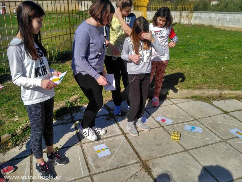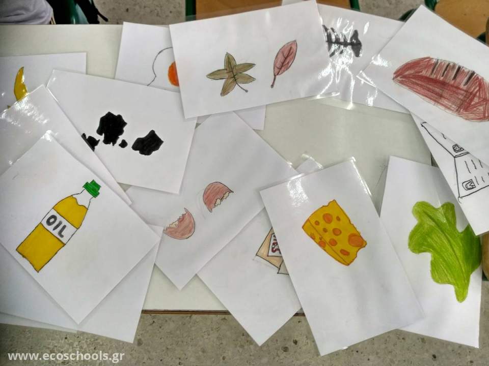 Ο σημερινός περίπατος μας έδωσε την ευκαιρία να δοκιμάσουμε το νέο μας παιχνίδι. Αφού θυμηθήκαμε ακόμη μία φορά ποια απορρίμματα μπαίνουν και ποια όχι στους κάδους κομποστοποίησης τα ζωγραφίσαμε, τα πλαστικοποιήσαμε, κατασκευάσαμε ένα μεγάλο ζάρι από σφουγάρια και... Ζωγραφίσαμε με κιμωλία στο δάπεδο έναν μεγάλο γαιωσκόληκα, τον χωρίσαμε σε τμήματα και βάλαμε από μια κάρτα σε καθένα. Ρίξαμε το ζάρι με τη σειρά και ανάλογα με το είδος των απορριμμάτων ή μαζεύαμε καρτέλες ή χάναμε τη σειρά μας. Νικητής αυτός που έφτανε στο τέλος με τις περισσότερες κάρτες.