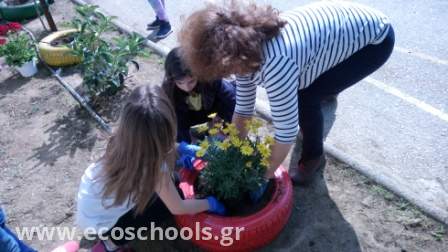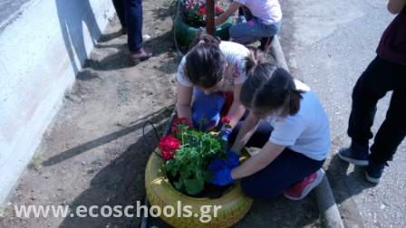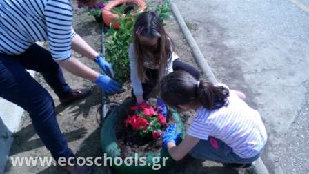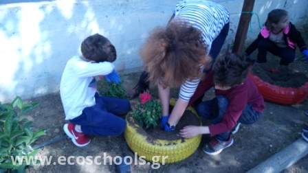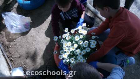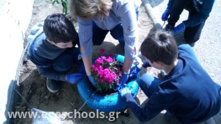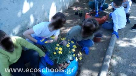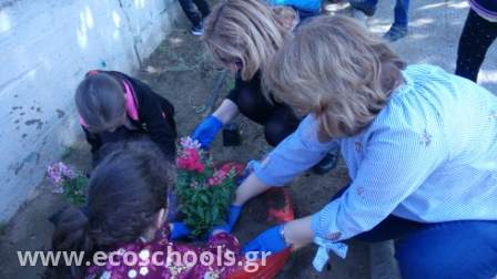 Το μήνα Απρίλιο αναλάβαμε όλη η ομάδα, μικροί και μεγάλοι, να φυτέψουμε λουλούδια στην αυλή μας     -μαργαρίτες, σκυλάκια, μολόχες, κινέζικα γαρύφαλλα, πολλά εποχιακά-. Η όψη του σχολείου μας άλλαξε και μαζί η διάθεση γεμίζοντας χρώμα σε ένα χώρο που ήταν αναξιοποίητος και φροντίζοντας με μεράκι και αγάπη τον κήπο μας! Το αποτέλεσμα είναι ιδιαίτερα ικανοποιητικό και είμαστε απόλυτα ικανοποιημένοι με απώτερο στόχο να συνεχίσουμε με παρόμοιες δράσεις.