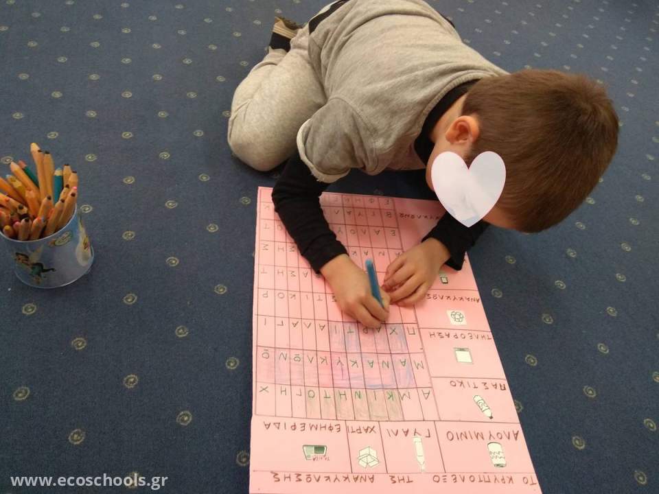 Οι μαθητές προσπάθησαν να ανακαλύψουν τις λέξεις που είχαν σχέση με την ανακύκλωση και κρύβονταν σε κάθε σειρά γραμμάτων. Η δραστηριότητα αυτή άρεσε πολύ στα παιδιά, όλα τα παιδιά ήθελαν να συμμετάσχουν και στο τέλος τα κατάφεραν!