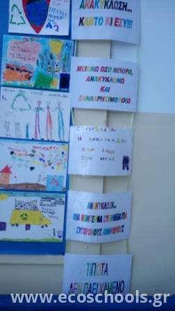 Τα παιδιά των δύο τμημάτων της Α΄ Τάξης(Α1 και Α2) και του Γ1 τμήματος του σχολείου μας ζωγράφισαν κατά ομάδες με θέμα την Ανακύκλωση, καθώς επίσης έγραψαν συνθήματα. Τις εργασίες τους τις αναρτήσαμε σε εσωτερικό χώρο του σχολείου.