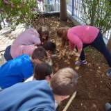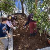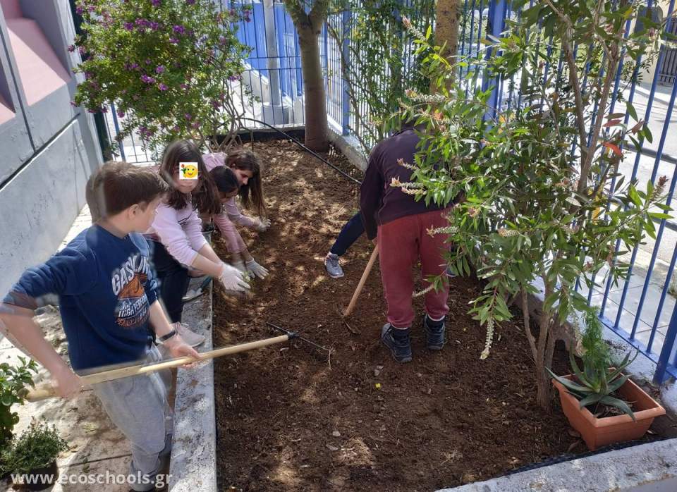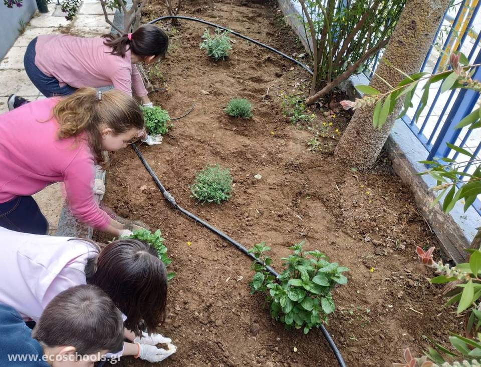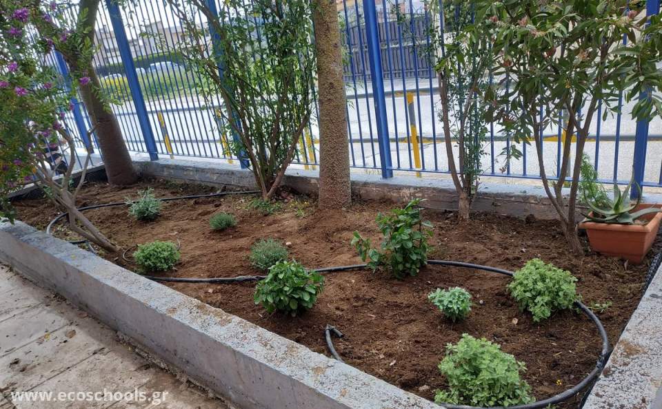 Οι μαθητές της Ε΄τάξης και οι μαθητές της Α΄τάξης καθάρισαν, έσκαψαν και φύτεψαν τα αρωματικά φυτά (ρίγανη, θυμάρι, βασιλικό, μέντα, λεβάντα κ.ά)