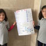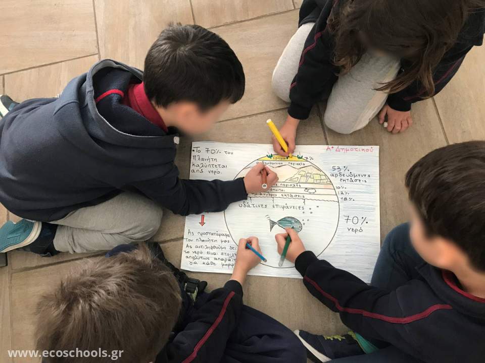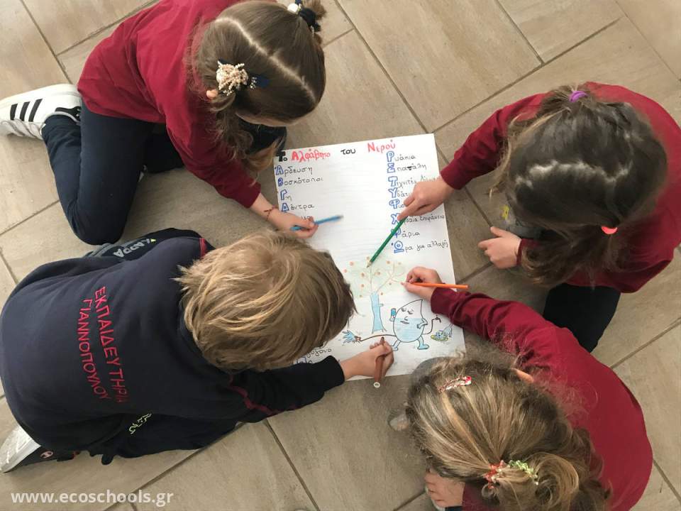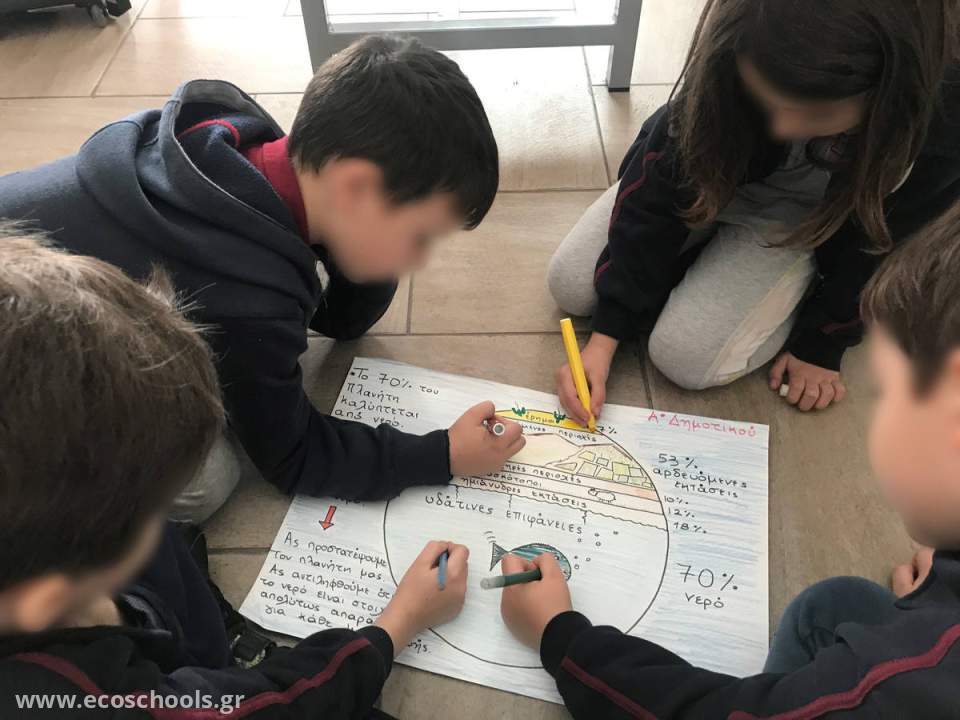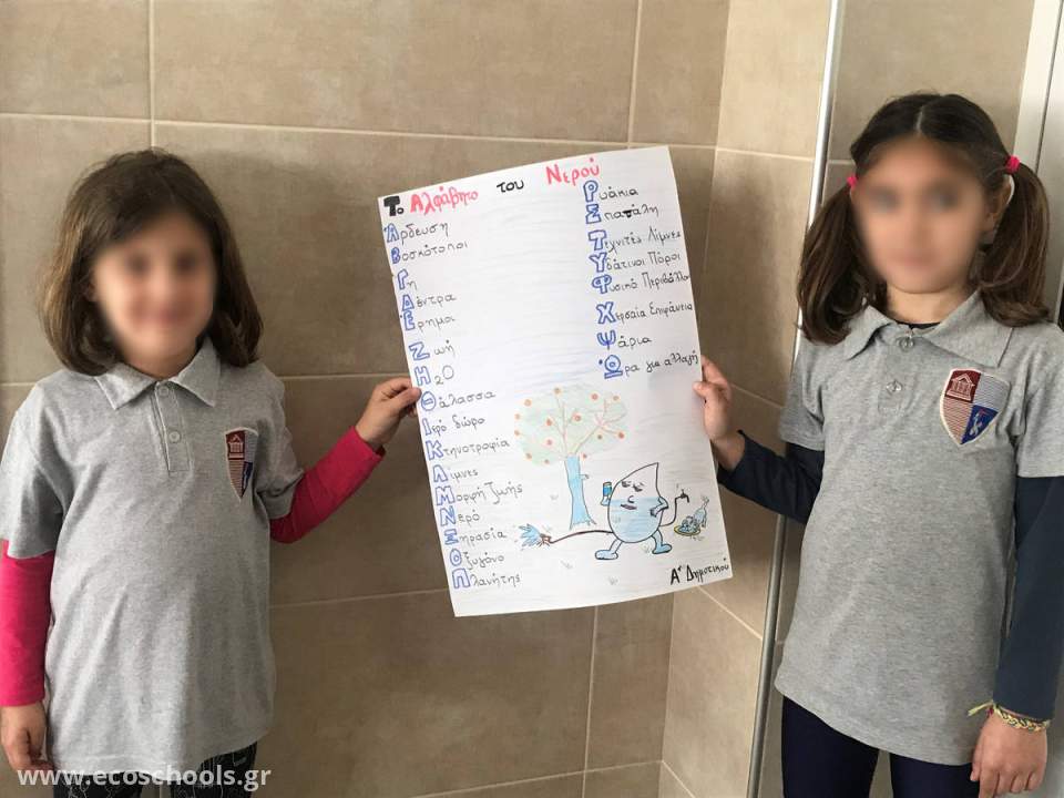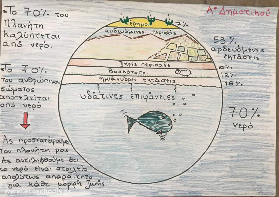 Οι μαθητές της Α’ Δημοτικού ασχολήθηκαν με την έννοια του νερού και τη σημασία του για την ύπαρξη ζωής. Έγινε μια περιγραφή του τρόπου κατανομής του νερού στον πλανήτη, με σκοπό τα παιδιά να αντιληφθούν τη χρησιμότητα αυτού. Μελέτησαν συγκεκριμένα τα οφέλη που προσφέρει στο κομμάτι της γεωργίας και της κτηνοτροφίας, αλλά και στην δυνατότητα που χρήσης αυτού από κάθε ζωντανό οργανισμό. Ως αντιπαραβολή είδαν το ανθρώπινο σώμα και το ποσοστό νερού που υπάρχει σε αυτό. Μέσω αυτής της σύγκρισης μπόρεσαν να καταλάβουν αμεσότερα το ότι όπως ένας οργανισμός χρειάζεται νερό για να ζήσει, έτσι και η Γη για να παραμείνει «ζωντανή» χρειάζεται το υδάτινο στοιχείο. Στο τέλος, οι μαθητές έφτιαξαν το «Αλφάβητο του Νερού».