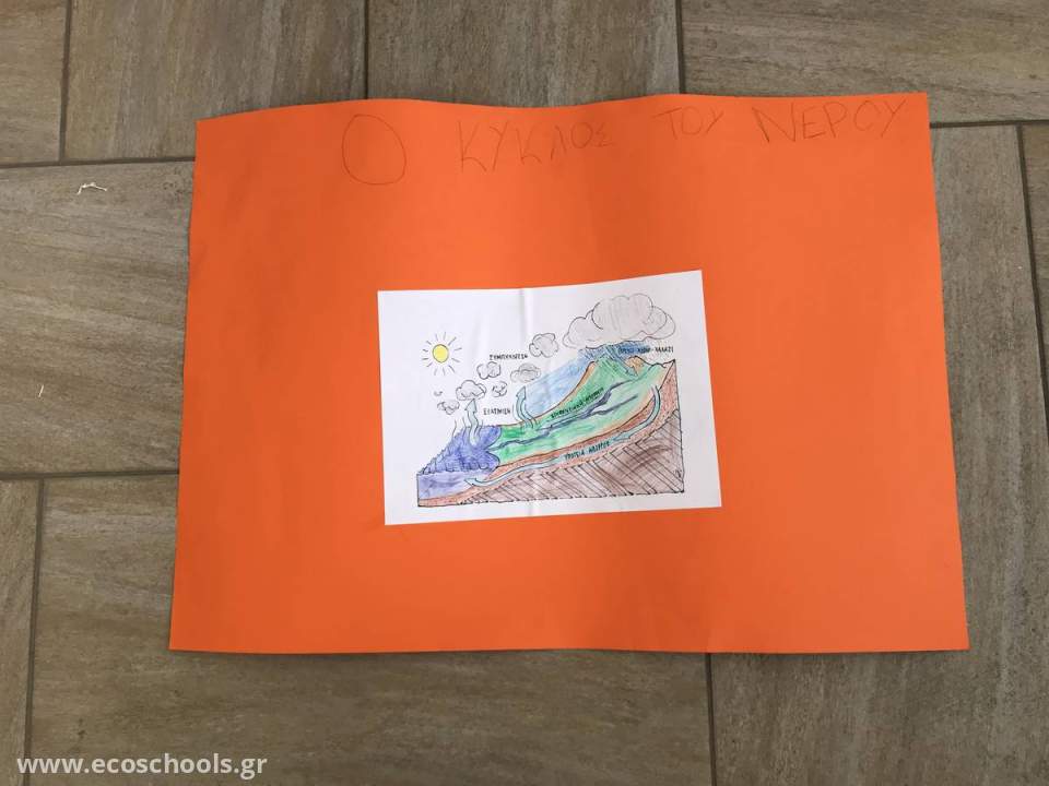 - Η πρώτη ομάδα εργάστηκε σχετικά με τον κύκλο του Νερού. Αφού ζωγράφισαν με ξυλομπογιές τον κύκλο του Νερού, τον τοποθέτησαν σε ένα χρωματιστό χαρτόνι.