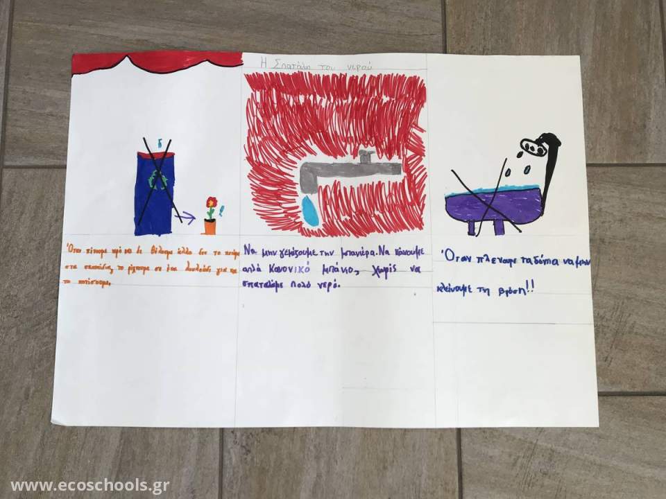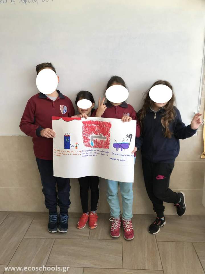 - Η τέταρτη ομάδα εργάστηκε με θέμα τη σπατάλη του Νερού. Έκαναν προτάσεις για την εξοικονόμηση του Νερού, τις οποίες και πλαισίωσαν με αντίστοιχες ζωγραφιές.