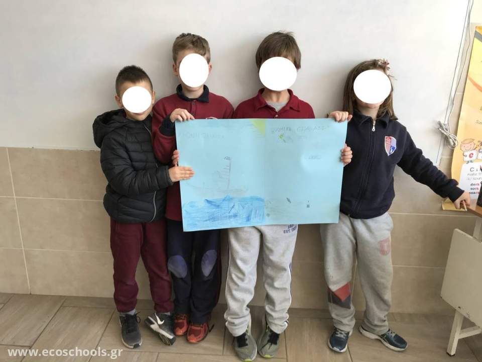 - Η δεύτερη ομάδα ασχολήθηκε με τη μόλυνση των θαλασσών. Έτσι, οι μαθητές μας αποφάσισαν να δημιουργήσουν πάνω σε χαρτόνι δυο εικαστικά έργα με θέμα τη θάλασσα, απεικονίζοντας έτσι στο μισό του χαρτονιού μια καθαρή θάλασσα, ενώ στο υπόλοιπο μισό μια βρώμικη θάλασσα. Με αυτόν ακριβώς τον τρόπο θέλησαν να τονίσουν την αντίθεση και να περάσουν το δικό τους μήνυμα για τη μόλυνση των υδάτων.