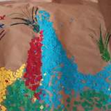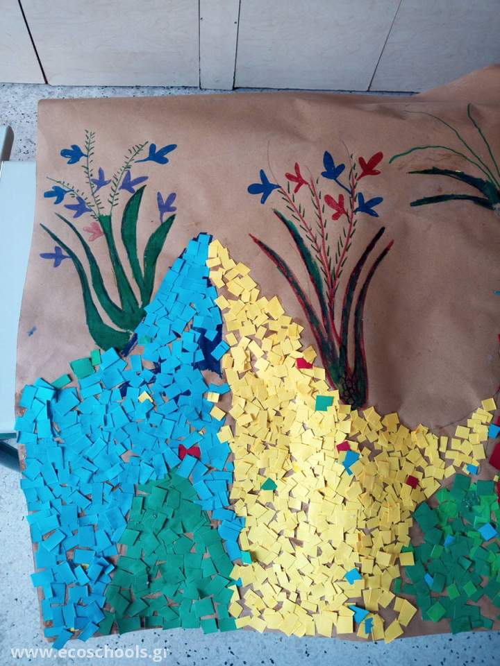 Τα υλικά που χρησιμοποιήθηκαν ήταν ανακυκλώσιμα: κομμάτια χαρτιού από άλλες κατασκευές, τα οποία έκοψαν με τα ψαλιδάκια τους και δημιούργησαν χρωματιστές ψηφίδες.