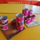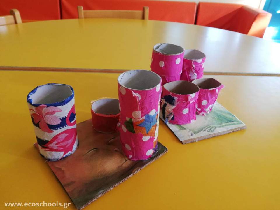 ΧΑΡΤΙΝΕΣ ΜΟΛΥΒΟΘΗΚΕΣ: Σε ρολά από χαρτί κουζίνας κολλήσαμε διάφορες χαρτοπετσέτες, τα κόψαμε και τα κολλήσαμε σε ένα κομμάτι χαρτόκουτας που το είχαμε ντύσει με σελίδες από παλιά παραμυθία.