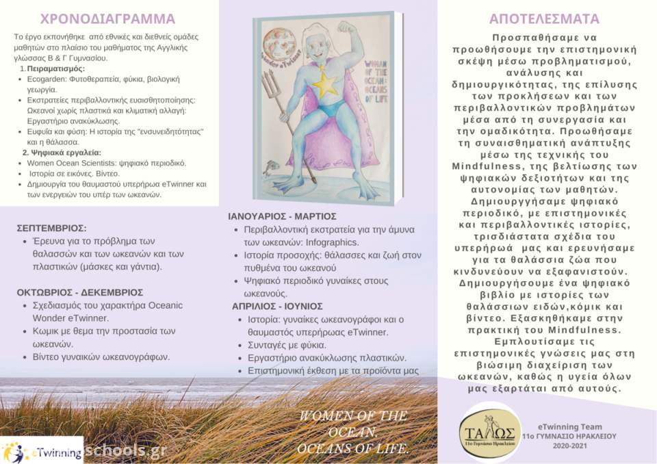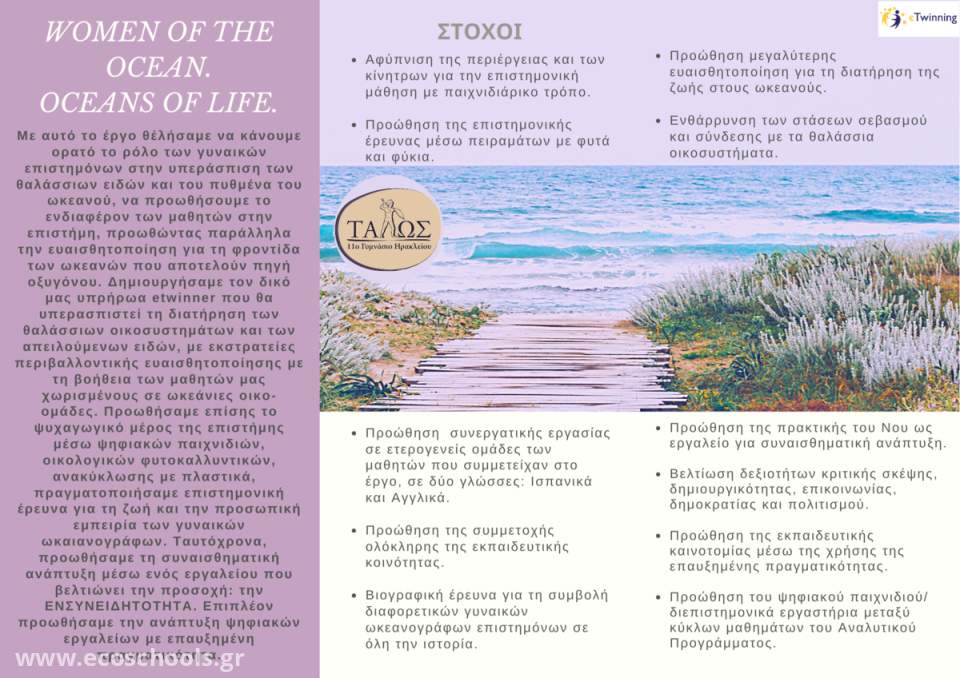 Με αυτό το έργο θέλουμε να καταστήσουμε ορατό τον ρόλο των γυναικών επιστημόνων στην υπεράσπιση των θαλάσσιων ειδών και του πυθμένα του ωκεανού, να συνεχίσουμε να προωθούμε το ενδιαφέρον των μαθητών για την επιστήμη, προωθώντας παράλληλα την ευαισθητοποίηση για τη φροντίδα των ωκεανών, που αποτελούν πηγή οξυγόνου και ζωής στον πλανήτη μας.