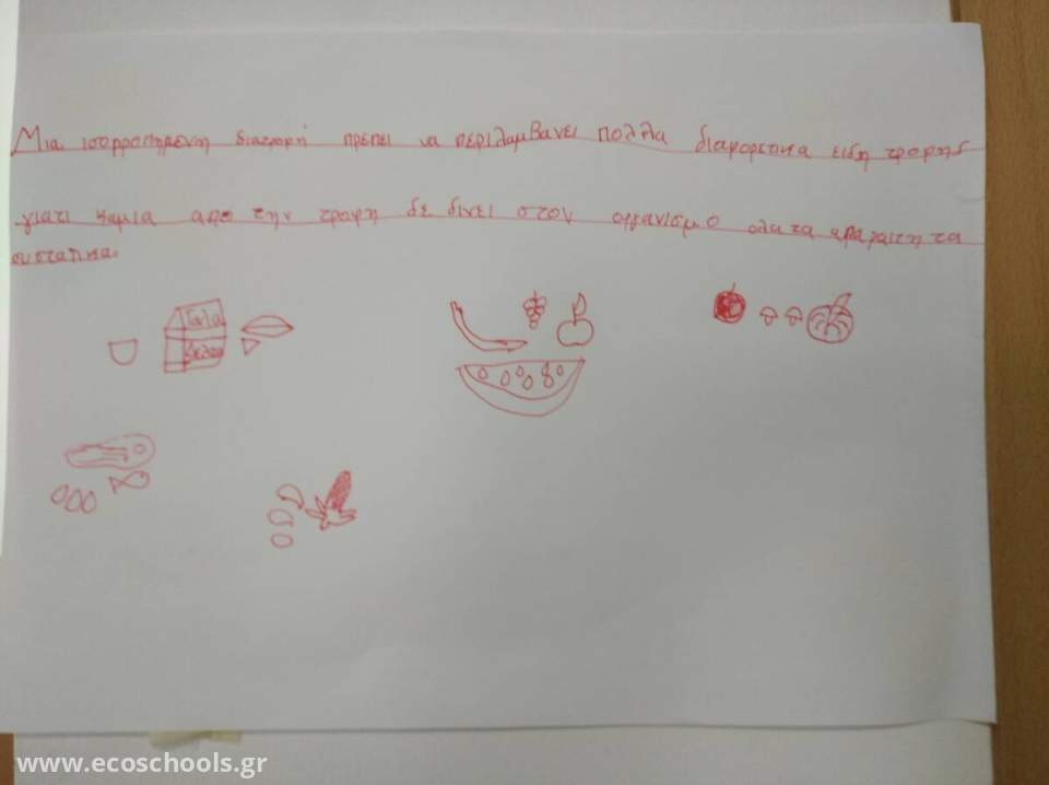 Κατόπιν μετά το άνοιγμα των σχολείων συμμετείχαμε στο πολύ ενδιαφέρον και διαδραστικό πρόγραμμα, γνωρίσαμε σωστές αρχές και συνήθειες καλής διατροφής για το σπίτι και το σχολείο, μάθαμε πώς και τι πρέπει να τρώμε σε αυτή την ηλικία. Στο τέλος κρατήσαμε το σύνθημα "Είμαστε ό,τι τρώμε"