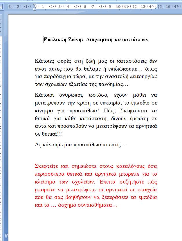 Η αναστολή λειτουργίας των σχολείων τον Νοέμβριο 2020 προκάλεσε ανησυχία, προβληματισμό και άγχος σε αρκετά παιδιά. Το γεγονός στάθηκε αφορμή να συζητήσουμε για το πώς επηρεάζει η πανδημία και η αναστολή λειτουργίας την ψυχολογία μας. Μέσα σε αυτό το κλίμα γεννήθηκε η ιδέα για ένα mini project με τίτλο "Διαχείριση καταστάσεων: Μετατρέπουμε την κρίση σε ευκαιρία ενδυνάμωσης". Εκμεταλλευόμενοι τη διαδικασία της σύγχρονης και ασύγχρονης εξ αποστάσεως εκπαίδευσης, καταφέραμε μέσα στο lockdown να δούμε την κρίση με πιο θετική ματιά και να μην εστιάζουμε μόνο στα αρνητικά συναισθήματα και τα εμπόδια που προκάλεσε η καραντίνα στην καθημερινότητά μας. Οι μαθητές/τριες, εξετάζοντας τις καταστάσεις με νηφαλιότητα, χιούμορ και φαντασία, βρήκαν ότι μπορούμε να βγούμε κερδισμένοι από την πανδημία αν εκμεταλλευτούμε προς όφελός μας τις καταστάσεις: μπορούμε, για παράδειγμα, να βοηθήσουμε το περιβάλλον να "ανασάνει", μπορούμε να αξιοποιήσουμε την ευκαιρία για να εξελιχθούμε τεχνολογικά, μπορούμε να βελτιώσουμε την ψυχολογία μας αξιοποιώντας καλύτερα τον χρόνο που περνάμε με την οικογένειά μας και να χρησιμοποίήσουμε εναλλακτικούς τρόπους να βρισκόμαστε με τους φίλους μας (http://1dim-glykon.att.sch.gr/index.php/contact/118-evropaika-programmat...).