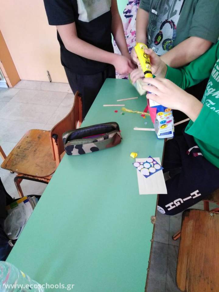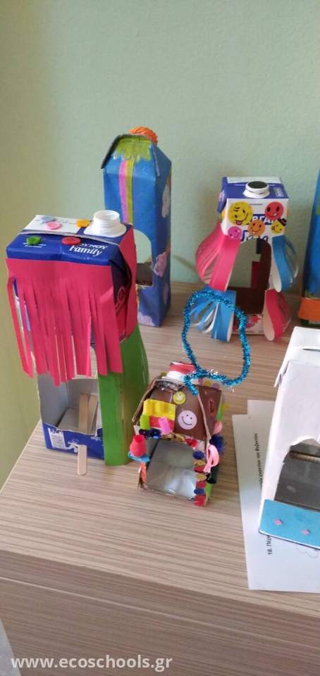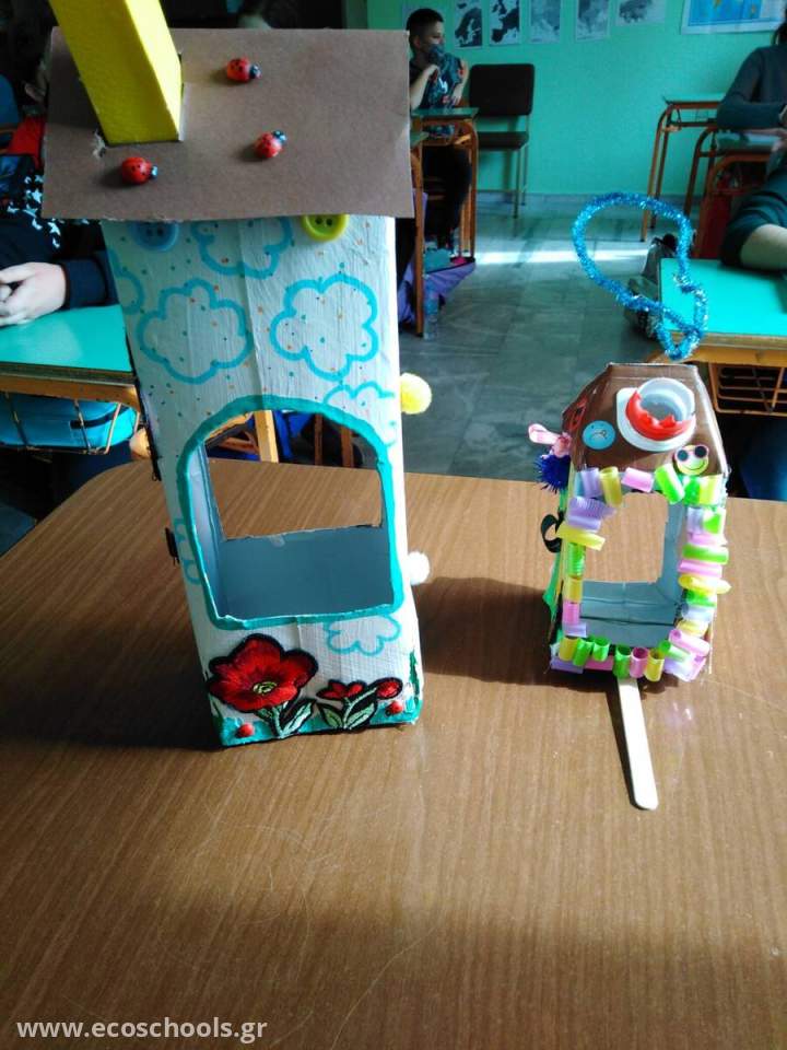 Στο πλαίσιο του προγράμματος οι δύο Στ' τάξεις ασχολήθηκαν με την κατασκευή ταϊστρών για τα πουλιά . Οι δάσκαλοι των δύο τμημάτων με τη βοήθεια της δασκάλας των Εικαστικών ανέλαβαν κι έφτιαξαν ταΐστρες χρησιμοποιώντας ανακυκλώσιμα υλικά, τα οποία κρεμάστηκαν σε κλαδιά των γυμνών δέντρων της αυλής του σχολείου μας και σε ψηλά σημεία. Οι φτερωτοί επισκέπτες δεν άργησαν να φανούν...