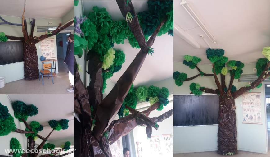 Στα πλαίσια διαμόρφωσης του εργαστηρίου Γεωπονίας, οι μαθητές μαζί με τις εκπαιδευτικούς τους, αξιοποίησαν τα ανακυκλώσιμα απορρίμματα του σχολείου και κατασκεύασαν ενα δέντρο πραγματικών διαστάσεων μέσα στην τάξης τους.