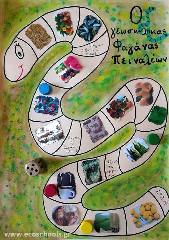 - Κατασκευή επιτραπέζιου παιχνιδιού ( ο αχόρταγος γεωσκώληκας) προκειμένου τα παιδιά να κατανοήσουν τη λειτουργία του κομποστοποιητή και ποια υλικά μπαίνουν σ ΄ αυτόν.