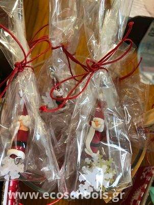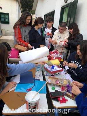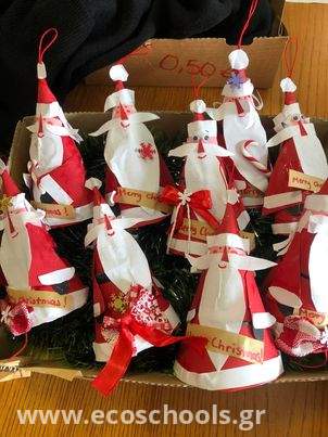 Μία εβδομάδα πριν το κλείσιμο του σχολείου ενόψει των εορτών, μαθητές από την περιβαλλοντική μας ομάδα, συγκεντρώθηκαν στο σχολείο κατά τις απογευματινές ώρες , για να δημιουργήσουν όμορφα , χριστουγεννιάτικα καλλιτεχνήματα από ανακυκλώσιμα υλικά και φυσικές πρώτες ύλες.(σκουλαρίκια απο πύλο, πορτοκάλια με γαρύφαλα και κανέλα , χάρτινα αγιοβασιλάκια και αγγελάκια ,κούπες,πετρούλες και βαζάκια ζωγραφισμένα από τα ίδια τα παιδιά κ.α.) με την καθοδήγηση και την συμμετοχή των καθηγητών τους. Τα κατασκευάσματά τους ήταν τελικά εντυπωσιακά, όπως μαρτυρούν και οι φωτογραφίες.