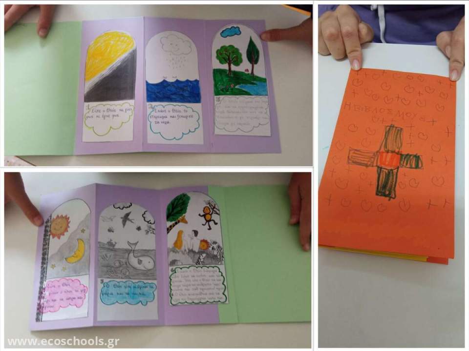 Μυήθηκαν σε πρακτικές δημιουργικότητας μέσα από δική τους κατασκευή, ανταποκρινόμενοι απόλυτα στις απαιτήσεις του αναλυτικού προγράμματος σπουδών και συμβατές με την ύλη του σχολικού βιβλίου της Α΄ Γυμνασίου. Προηγήθηκε εισαγωγικό μάθημα με την επεξεργασία διηγήσεων της Παλαιάς Διαθήκης για την δημιουργία του κόσμου, για να έρθουν σε επαφή με κείμενα της βίβλου και τα μέρη της. Επίσης, παρακολούθησαν βίντεο με θέμα την δημιουργία του κόσμου και επακολούθησε εποικοδομητική σχετική συζήτηση.