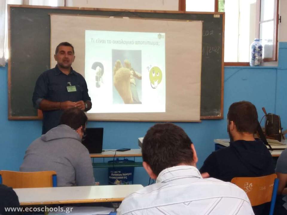 Την Τετάρτη 9 Νοεμβρίου οι μαθητές της Α’1 Λυκείου, Β’ Λυκείου, Γ’ Γεωπονίας, Δ’ Φυτικής Παραγωγής παρακολούθησαν το Πρόγραμμα «Το Οικολογικό Αποτύπωμα της διατροφής» του Κέντρου Εκπαίδευσης για το Περιβάλλον και την Αειφορία Πεταλούδων Ρόδου (Κ.Ε.ΠΕ.Α.-Κ.Π.Ε.). Τα μέλη της παιδαγωγικής ομάδας του κέντρου , κος Χαράλαμπος Συργιάννης και κα Αικατερινή Νεανίδου , επισκέφτηκαν το σχολείο μας και παρουσίασαν στους μαθητές το βιωματικό πρόγραμμα. Οι μαθητές έμαθαν ότι το οικολογικό αποτύπωμα μετράει το πόσο οι καθημερινές μας ενέργειες και συνήθειες επιβαρύνουν τους πόρους του πλανήτη μας, ποιο είναι το οικολογικό αποτύπωμα της χώρας μας και τι μπορούμε εμείς να κάνουμε για να μειώσουμε το αποτύπωμα μας. Η παρουσίαση του προγράμματος ολοκληρώθηκε με ένα παιχνίδι, το οποίο μας βοήθησε να κατανοήσουμε το ταξίδι που κάνουν τα προϊόντα, από τις μονάδες παραγωγής μέχρι το σπίτι μας.
