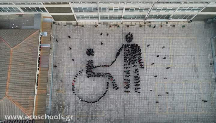 Στο πλαίσιο αυτής της Παγκόσμιας Ημέρας, οι μαθητές του σχολείου μας συμμετείχαν σε σχετική βιωματική δράση. Αρχικά οι μαθητές των τομέων Δομικών έργων και Εφαρμοσμένων τεχνών με την καθοδήγηση των εκπαιδευτικών τους σχεδίασαν στον αύλειο χώρο του σχολείου την εικόνα ενός ατόμου να συμπαραστέκεται σε έναν άνθρωπο σε αναπηρικό αμαξίδιο. Στη συνέχεια οι μαθητές του σχολείου διαμόρφωσαν με τα σώματα τους το παραπάνω σκαρίφημα.