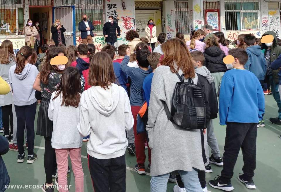 Στη λιτή εκδήλωση, λόγω των μέτρων για τον περιορισμό του covid19, οι μαθητές/τριες της Ε’2 τάξης παρουσίασαν συνοπτικά τις δράσεις που πραγματοποιήθηκαν τα σχολικά έτη 2019-2020 και 2020-2021 στο πλαίσιο του περιβαλλοντικού προγράμματος «Νοιαζόμαστε για το περιβάλλον, αγκαλιάζουμε το σχολειό μας!» και συνέβαλαν καθοριστικά στην ένταξή μας στο Διεθνές Δίκτυο των Οικολογικών Σχολείων. Επίσης, διάβασαν και επέδωσαν στον εκπρόσωπο του Δήμου επιστολή τους στην οποία αναδεικνύουν το μεγάλο πρόβλημα των βανδαλισμών που υφίσταται το σχολείο από εξωσχολικούς και προτείνουν λύσεις για την αντιμετώπισή του. Οι μαθητές/τριες της Στ’2 τάξης παρουσίασαν αφίσες με μηνύματα που φιλοτέχνησαν, ενώ οι μαθητές/τριες της Γ’2 τάξης παρουσίασαν και δώρισαν στον εκπρόσωπο του Δήμου τη δική τους «πράσινη βίβλο», ένα βιβλιαράκι που δημιούργησαν κατά την ενασχόλησή τους με κρίσιμα περιβαλλοντικά ζητήματα στο πλαίσιο των Εργαστηρίων Δεξιοτήτων. Επίσης, όλα τα παιδιά αναφώνησαν το σύνθημα «Όλοι μαζί μπορούμε!» στα αγγλικά, παροτρύνοντας έτσι τους συμμαθητές και τις συμμαθήτριές τους να συνεχίσουν τις δράσεις τους για ένα καλύτερο αύριο! Τέλος, οι μαθητές/τριες του Ε’2 τμήματος «εγκαινίασαν» τον κόκκινο κάδο ανακύκλωσης ενδυμάτων, υποδημάτων και λευκών ειδών που είχε πρόσφατα τοποθετηθεί από τον Δήμο έξω από το σχολείο μας.