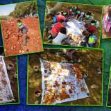 Τώρα που ζεσταθήκαμε θα χωριστούμε σε δύο ομάδες. Η μία θα παίξει με χώμα και νερό και θα κάνει λασποζωγραφιές!!!! Υπέροχη επαφή με τη φύση! Αφού σκάψαμε καλά και βρήκαμε το κατάλληλο χώμα, ρίξαμε νερό, πήραμε τα πινέλα μας και γίναμε λασποζωγράφοι φτιάχνοντας τη σημαία του σχολείου μας! Από τη ζωγραφική πήγαμε στη γλυπτική και φτιάξαμε και το πρόσωπο ενός αγαπημένου μας ποδοσφαιριστή πάνω σε ένα δέντρο. Ναι, βέβαια, βάλαμε και μαλλιά και μάτια και στόμα!